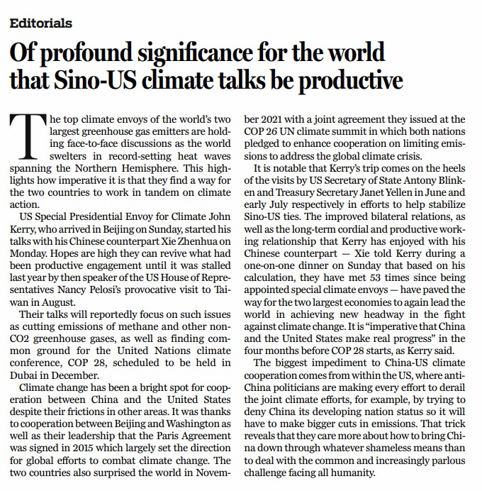 在举世关注中,世界最大的两个经济体的气候特使举行了面对面会谈。当前,北半球正在经历创纪录的热浪,凸显了中美在气候问题上携手合作多么重要。