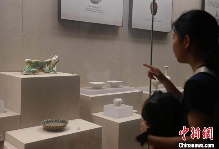 2023年7月13日,人们在安徽博物院参观“宋三彩卧女抱鹅枕”(左上)。 中新社记者 韩苏原 摄