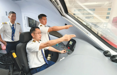 4月13日,在老挝万象站,中老双方司机在首列万象至昆明的中老铁路国际旅客列车上为发车做准备。