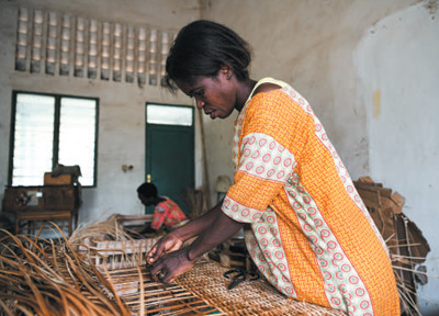 6月21日,在位于布隆迪经济首都布琼布拉的卡蒙盖手工业培训中心,学员在生产车间制作藤编产品。