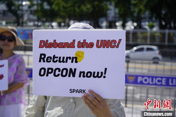 8月21日,韩国民间团体“和平统一开创者”举行抗议集会,敦促韩国政府停止韩美军演。图为集会中手持标语的民众。 中新社记者 刘旭 摄