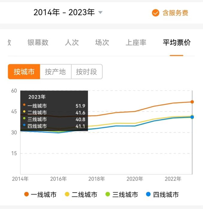 另外,相较二三四线城市,一线城市票价明显较贵。继2022年冲上50元大关后,2023年,一线城市平均票价达到51.9元,二三四线城市近两年则涨至40元以上。