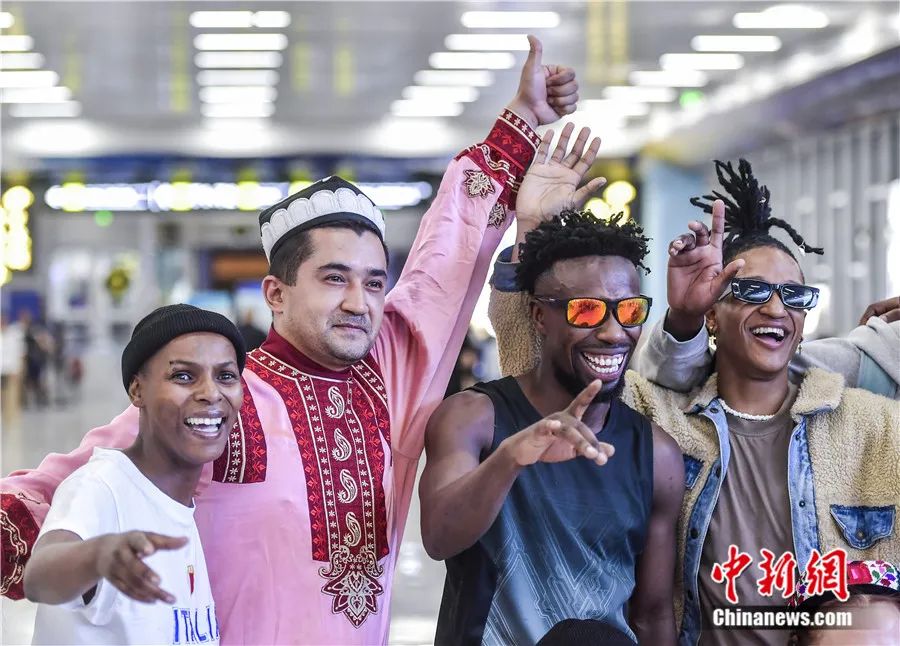 2023年7月23日,参加第六届中国新疆国际民族舞蹈节的南非埃尔维斯舞蹈艺术团乘机抵达乌鲁木齐,主办方用新疆歌舞迎接远道而来的客人。刘新 摄