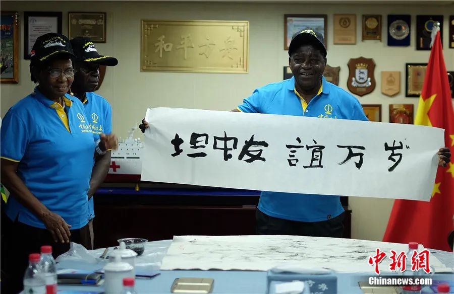67岁的坦赞铁路坦方员工秋马展示自己书写的“坦中友谊万岁”书法作品。江山 摄