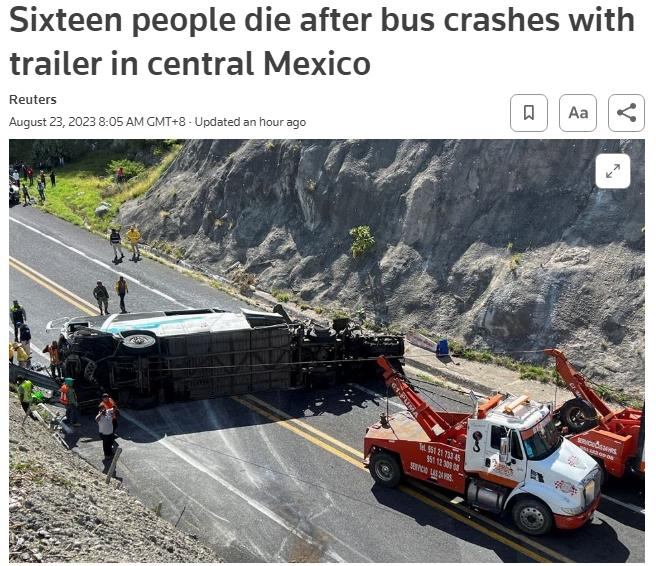 墨西哥高速公路大巴车与拖车相撞 已致16死36伤