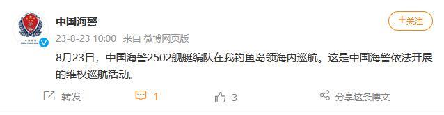 中新网8月23日电 据中国海警局官方微博消息,8月23日,中国海警2502舰艇编队在中国钓鱼岛领海内巡航。这是中国海警依法开展的维权巡航活动。
