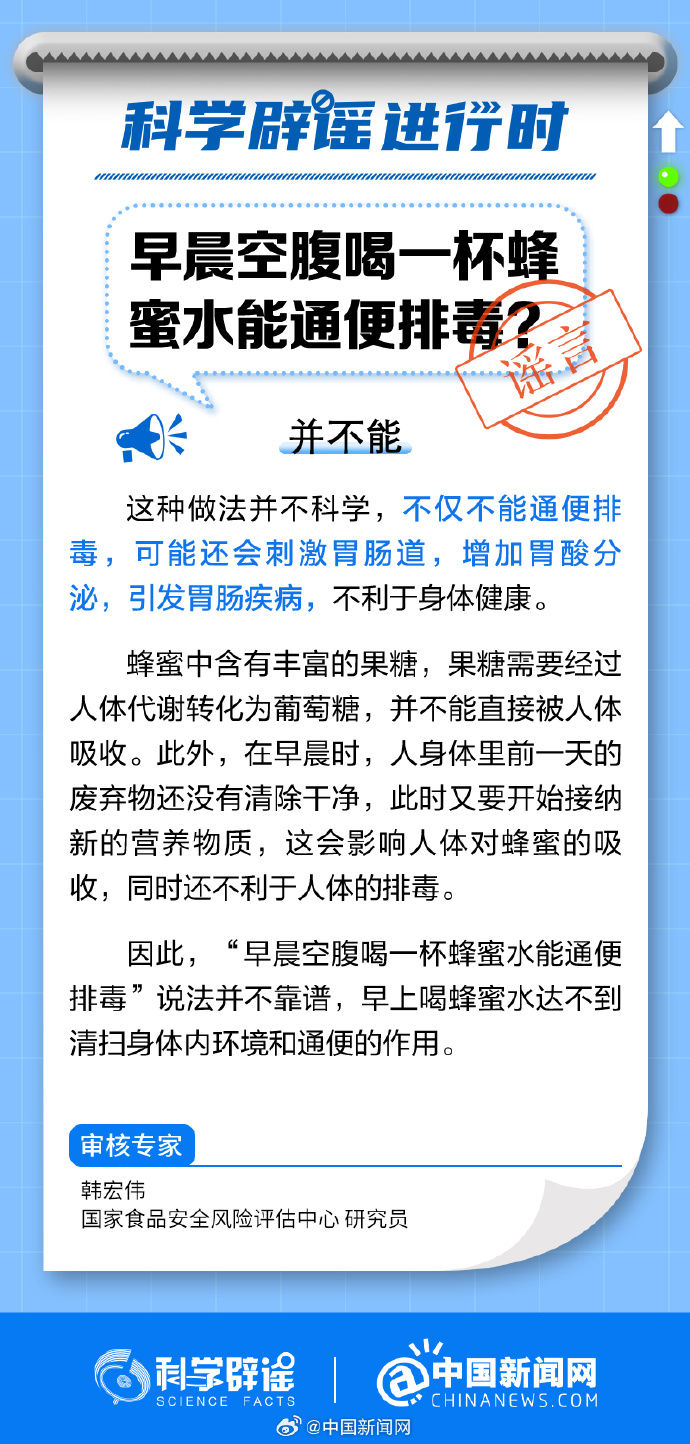 中新网8月22日电 早晨空腹喝蜂蜜水不仅不能通便排毒,可能还会刺激胃肠道,增加胃酸分泌,引发胃肠疾病。蜂蜜中含有丰富的果糖,果糖需要经过人体代谢转化为葡萄糖,并不能直接被人体吸收。在早晨,人身体里前一天的废弃物还没有清除干净,此时又要开始接纳新的营养物质,这会影响人体对蜂蜜的吸收,还不利于人体的排毒。(来源:@科学辟谣 @中国新闻网 )