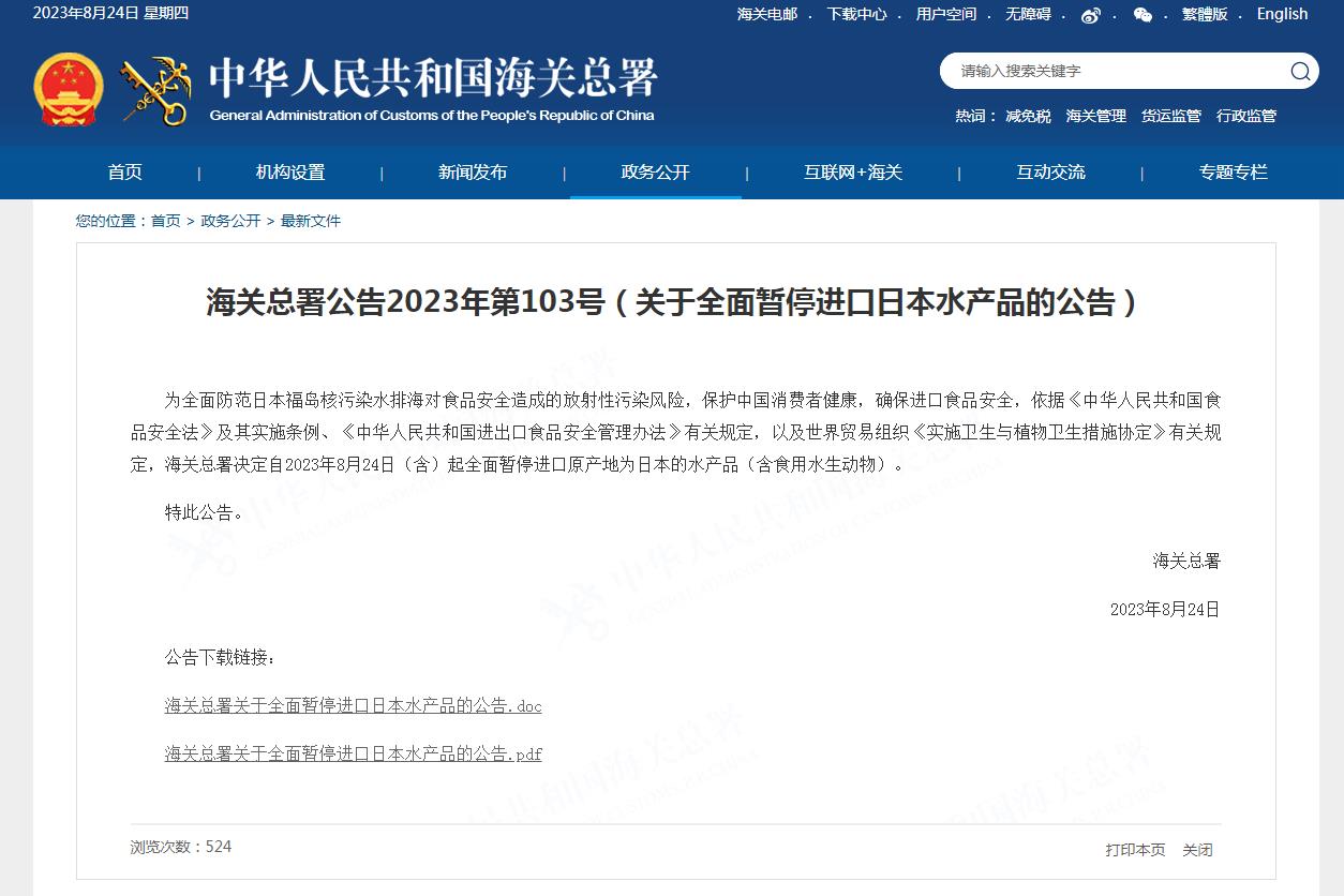 海关总署:即日起全面暂停进口原产地为日本的水产品