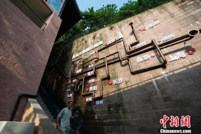 重庆故宫文物南迁纪念馆内一处外墙展示的故宫文物南迁路线。何蓬磊 摄