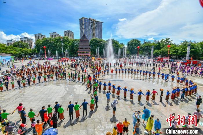嬉水节活动现场,台湾同胞与当地民众一道载歌载舞欢度“七夕”。 骆云飞 摄