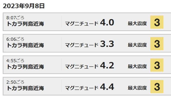 据报道,4次地震的震级分别为4.4级、4.2级、3.3级和4.0级,震中都位于鹿儿岛县吐噶喇列岛附近,附近的土岛村有明显震感。