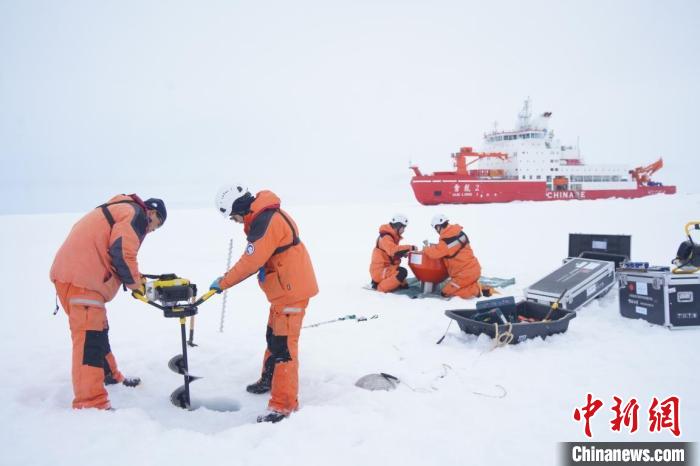 近日,中国第13次北冰洋科学考察队在北极点附近开展海冰综合作业。(自然资源部供图)