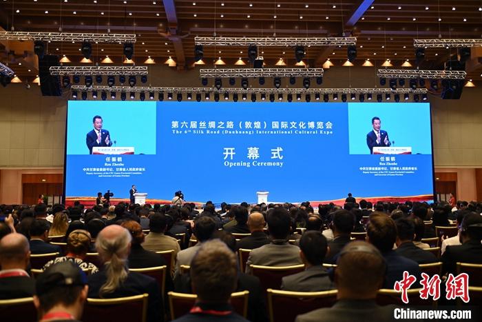 9月6日,第六届丝绸之路(敦煌)国际文化博览会在古丝路名城甘肃敦煌开幕。此次文博会以“沟通世界:文化交流与文明互鉴”为主题。图为开幕式现场。 中新社记者 李亚龙 摄
