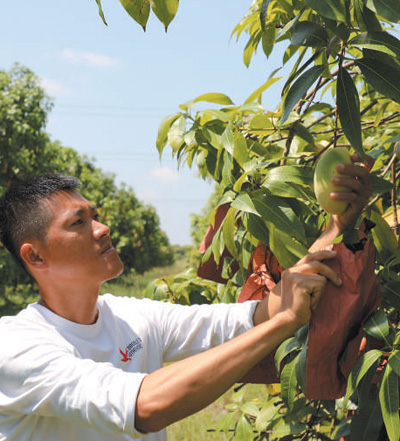 柬埔寨磅士卑省一个芒果园内,果园主管布南正在细致检查芒果长势。该果园生产优质芒果,远销至中国、俄罗斯、日本和韩国。
