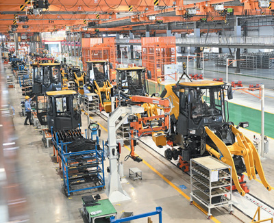 6月2日,广西柳州市柳工装载机灯塔工厂里,工人在升级后的车间里赶制海外订单。