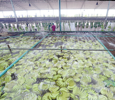 柬埔寨磅湛省的地泽香蕉园加工厂内,巨大的清洗池里满是刚刚采摘下来的香蕉。这些香蕉将运往中国销售。