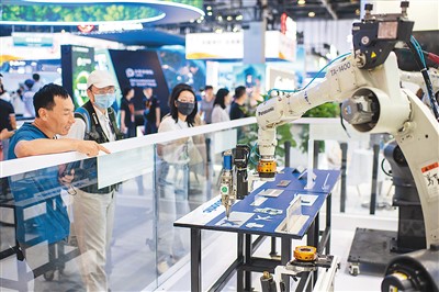 9月4日,在服贸会综合展区,参观者正在观看智能焊接机器人工作。