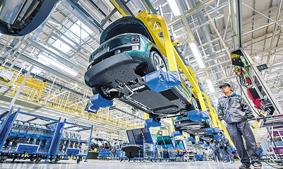 长江经济带生产制造和出口的新能源汽车日渐成为中国出口的“金名片”。图为一家车企江苏常州基地的工人在加紧生产。