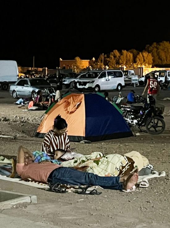 抵达目的地瓦尔扎扎特,已是9日凌晨1时左右。记者看到,许多当地民众在马路上席地而眠。4名结伴的当地青年告诉记者:地震发生时大家都很害怕,纷纷来到广场上,因为担心余震,今晚就打算这样过夜了。