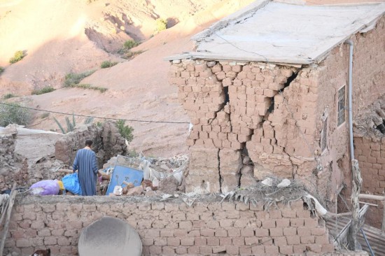 9月9日,在摩洛哥马拉喀什附近,居民查看遭地震损毁的建筑。新华社发(艾萨摄)