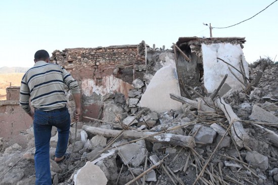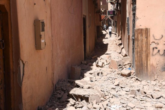 9月9日,在摩洛哥马拉喀什附近,居民走在遭地震损毁的建筑废墟上。新华社发(艾萨摄)