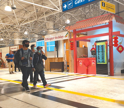 旅客经过埃塞俄比亚博莱国际机场内的中文服务台。