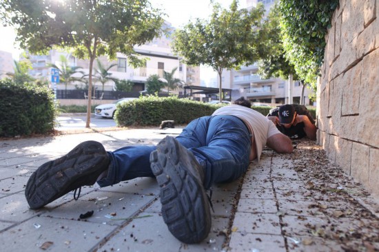 ↑10月7日,在以色列南部城市阿什克隆,民众匍匐在地躲避火箭弹袭击伤害。新华社发(伊兰·阿萨亚格摄/基尼图片社)