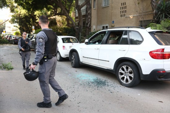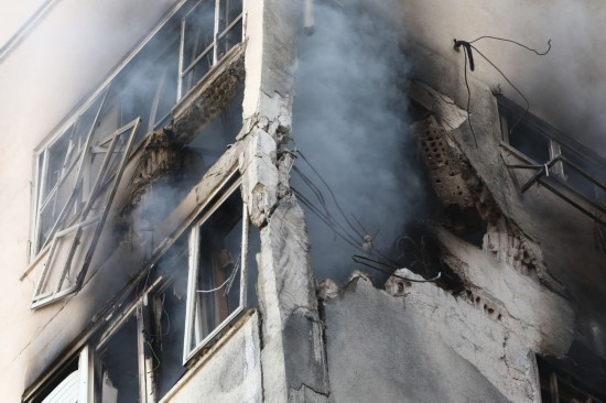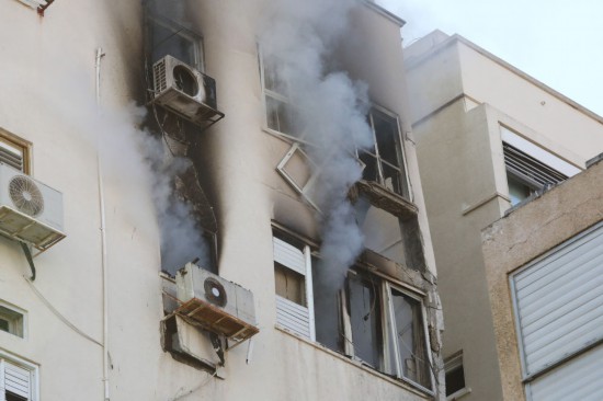 ↑这是10月7日在以色列特拉维夫拍摄的一栋遭火箭弹袭击的建筑。新华社发(吉德翁·马科维奇摄/基尼图片社)