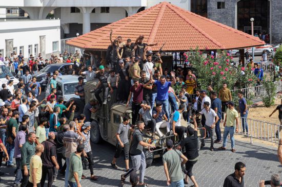 ↑10月7日,在加沙城,巴勒斯坦人登上一辆以色列军用车辆。新华社发(里泽克·阿卜杜勒贾瓦德摄)