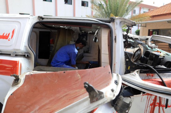 ↑这是10月7日在加沙地带城市汗尤尼斯拍摄的在以色列空袭中受损的救护车。新华社发(哈立德·奥马尔摄)