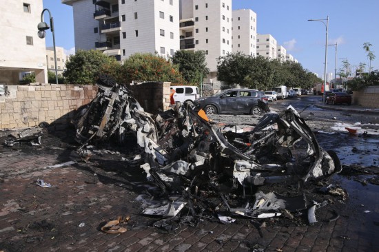 ↑这是10月7日在以色列南部城市阿什克隆拍摄的遭火箭弹破坏的车辆。新华社发(伊兰·阿萨亚格摄/基尼图片社)