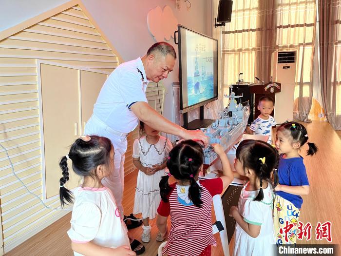 图为潘雄为幼儿园小朋友介绍舰艇知识。漳州市退役军人事务局 供图