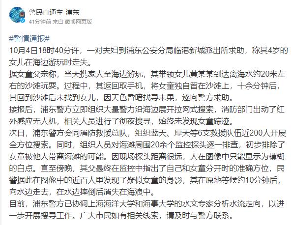 中新网10月6日电 据上海市公安局浦东分局官方微博消息,上海浦东警方发布一则通报:10月4日18时40分许,一对夫妇到浦东公安分局临港新城派出所求助,称其4岁的女儿在海边游玩时走失。