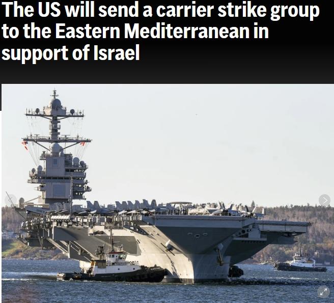 据美联社报道,当天,美国国防部长奥斯汀发表声明称,他下令“杰拉尔德·R·福特”号航空母舰战斗群移至更靠近以色列的东地中海,包括一艘航空母舰、一艘导弹巡洋舰和四艘导弹驱逐舰,以展示武力,准备应对任何情况,这些情况包括阻止更多武器送达巴勒斯坦伊斯兰抵抗运动(哈马斯)以及进行监视。