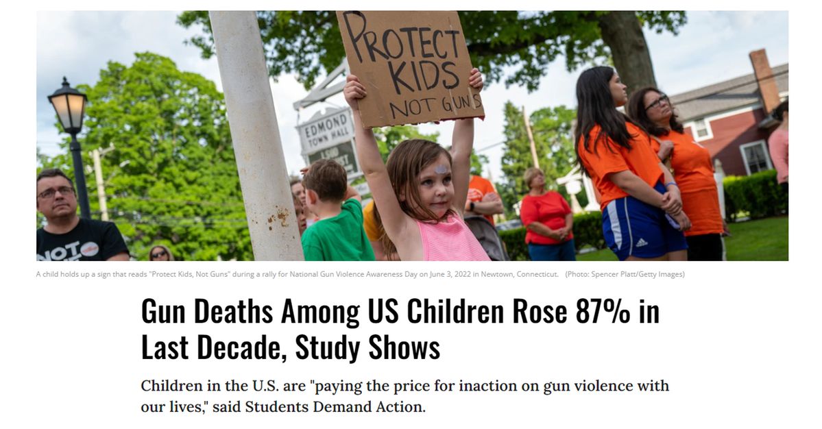 文章表示,在过去的十年里,美国共和党议员和枪支游说团体竭尽全力反对在美国减少枪支获取并确保儿童远离枪支的提议,而死于枪支暴力的儿童人数几乎翻了一番,在2011年至2021年间增长了87%。