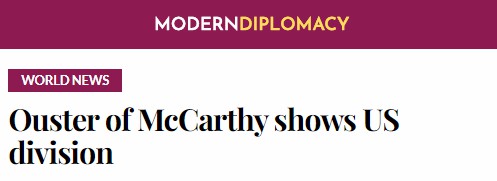 欧洲《现代外交》网站在6日的报道指出,凯文·麦卡锡(Kevin McCarthy)的美国国会众议院议长职位于本月3日被罢免,成为自1875年以来任期最短的议长。据相关消息,在麦卡锡与民主党人合作通过短期拨款法案以避免美国政府停摆后,少数极右翼共和党人与民主党人一道罢免了这位加利福尼亚州共和党人。