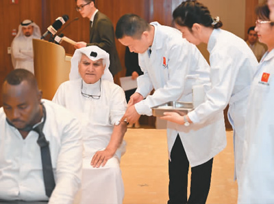 中国(吉林)第15批援科威特医疗队在展示针灸治疗。