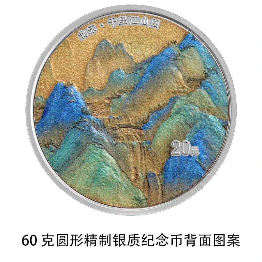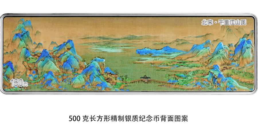 该套金银纪念币背面图案均为《千里江山图》局部场景,并刊“北宋·千里江山图”字样及面额。