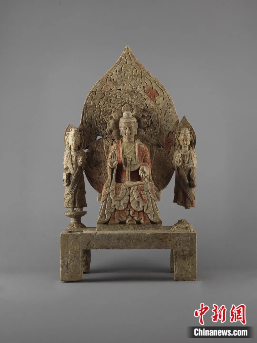 何利群:“谭副造释迦像”残高1.28米,主尊高77.7厘米,青石材质,是一尊一佛二菩萨背屏式造像,通体彩绘贴金。它由数十件碎块拼接缀合而成,是邺城地区出土时代最早的北魏造像之一,也是其中形体较大的一件。