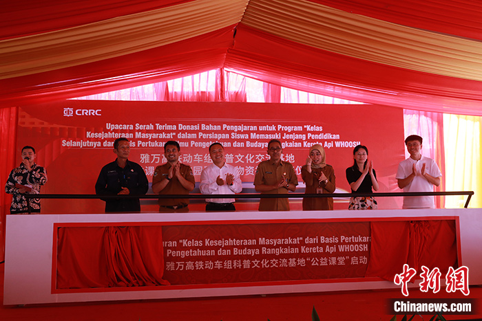 当地时间10月24日,雅万高铁动车组科普文化交流基地公益课堂进校园暨教学物资捐赠交接仪式在印尼万隆岸普拉第三国立初级中学举行,这是中国高铁公益课堂首次走进印尼校园。图为仪式启动现场。 中新社记者 李志全 摄
