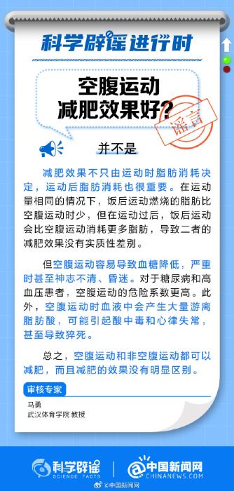 中新网10月24日电 空腹运动和非空腹运动都可以减肥,且减肥的效果没有明显区别。但空腹运动容易导致血糖降低,严重时会造成神志不清、昏迷。对于糖尿病和高血压患者,空腹运动的危险系数更高。此外,空腹运动时血液中会产生大量游离脂肪酸,可能引起酸中毒和心律失常,甚至导致猝死。(来源:@科学辟谣 @中国新闻网 )