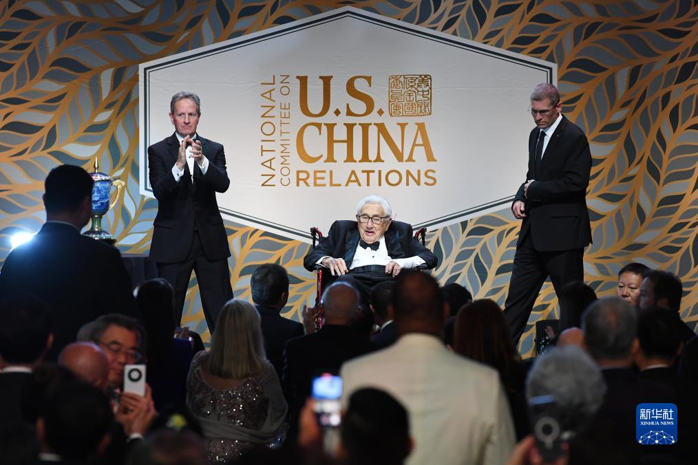 10月24日,美国前国务卿基辛格(中)出席在纽约举行的美中关系全国委员会年度颁奖晚宴。新华社记者 李睿 摄