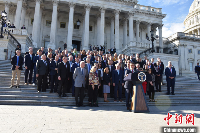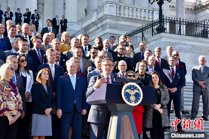 图为约翰逊当选议长后在记者会上表示,过去几周的议长选举让共和党人“更强大”,“我们将立刻全力以赴开始工作”。 中新社记者 沙晗汀 摄