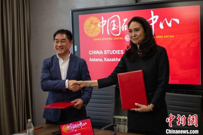 当地时间24日,哈萨克斯坦阿斯塔纳,哈萨克斯坦中国研究中心主任古丽娜尔与上海交通大学医学院院长办公室副主任童天朗签署合作备忘录。 主办方供图