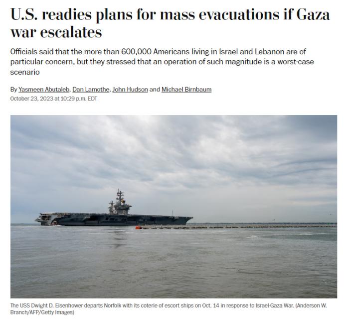 报道还称,根据美国政府可能展开的撤离公民行动的规模,这场行动可能比以往的任何撤离公民行动都更加困难。此次行动可能涉及10月已经“涌入”中东地区的美国空军飞机和海军舰艇。