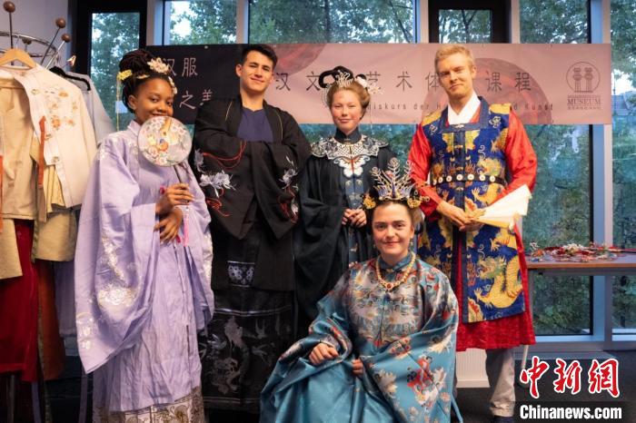 图为德国学生身着汉服参与汉文化体验课程,学习汉服文化。汉文化艺术交流中心供图