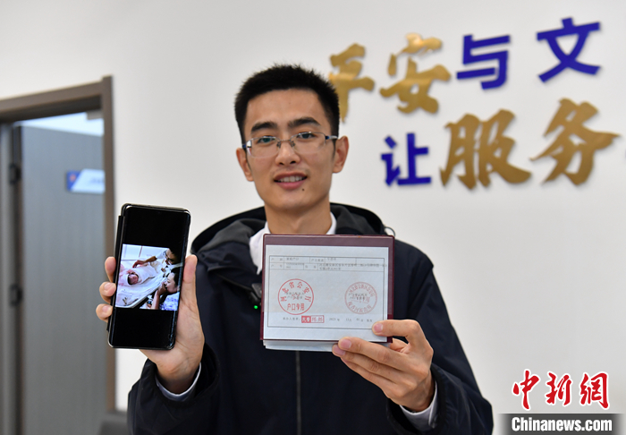 图为新生儿父亲展示女儿照片和带有“河北雄安新区”字样的户口页。 中新社记者 韩冰 摄