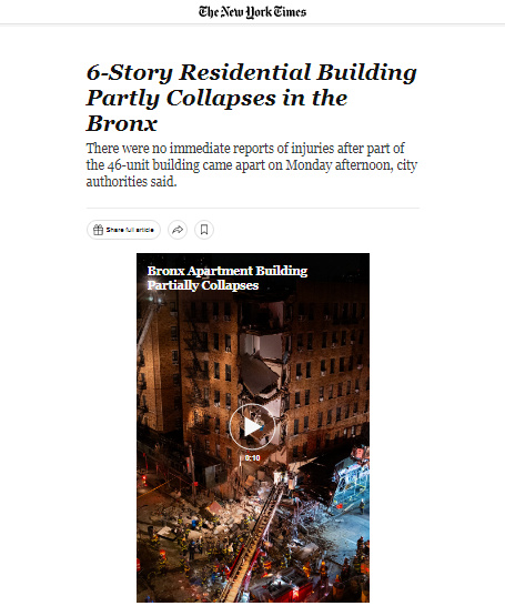 中新网12月12日电 据《纽约时报》报道,当地时间11日下午,美国纽约市布朗克斯区一栋建筑发生部分坍塌,目前暂无人员伤亡报告。
