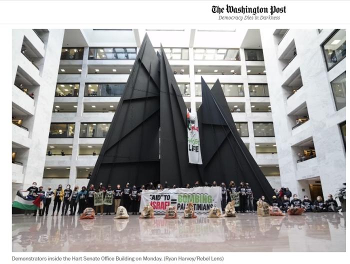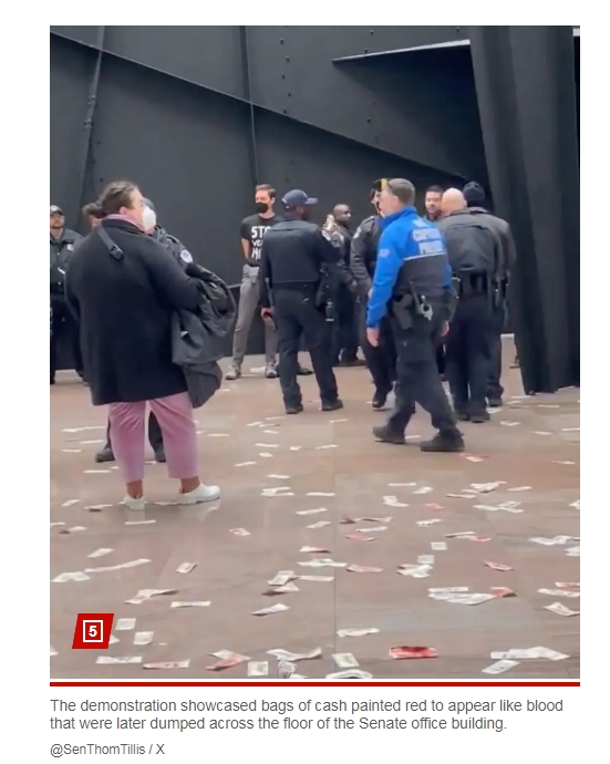 抗议者要求加沙停火 美参议院大厅现“血迹斑斑”美钞