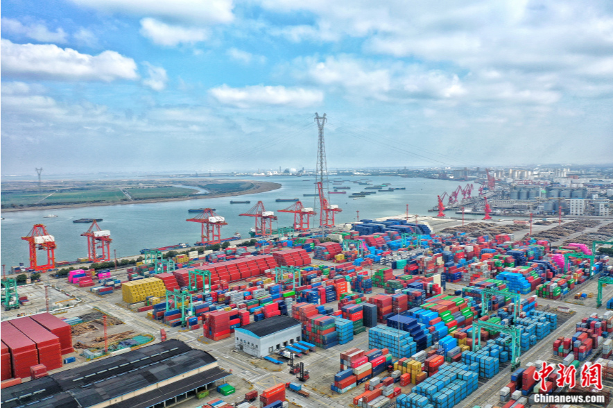 船舶在江苏省张家港永嘉集装箱码头泊位上装卸货物。施柏荣 摄